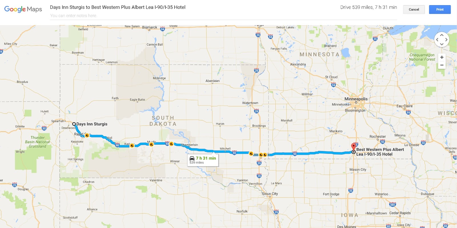 Interstate all the way, mostly 80 mph. Sturgis SD to Albert Lea MN